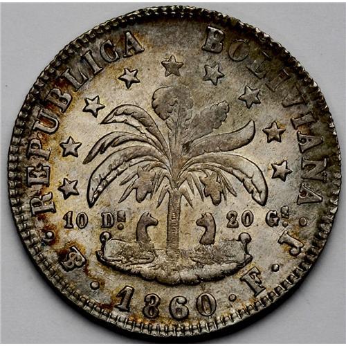 <B>Republic 8 Soles - Transitional Types, </B></I>KM138.3 1859-FJ, choice toned XF-AU, PESO 400 Gs below the bust, and KM138.6 1860-FJ, toned AU, very attractive.