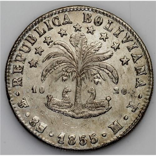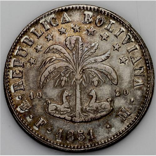 <B>Republic 8 Soles - Type Tandem, </B></I>KM109 1851-FM, toned AXF and KM112.2 1855-MJ, bold XF-AU.