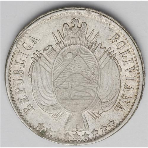 <B>Republic Boliviano 1866-FP Inverted FP, </B></I>KM152.1, lightly toned VF-XF, natural edge flaw at 5 o'clock. Rare variety with both assayer's initials up-side-down.
