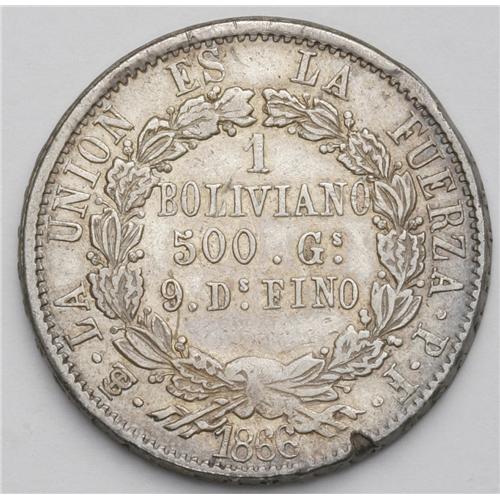 Republic Boliviano 1866-FP Inverted FP, KM152.1, lightl Republic Boliviano 1866-FP Inverted FP,