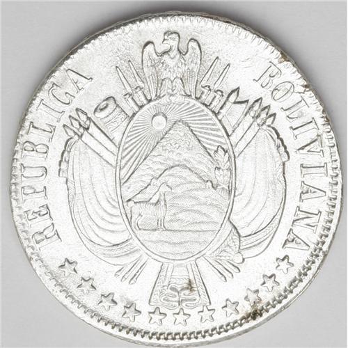 Republic Boliviano 1867-FE, KM152.2, choice lustrous AU Republic Boliviano 1867-FE,