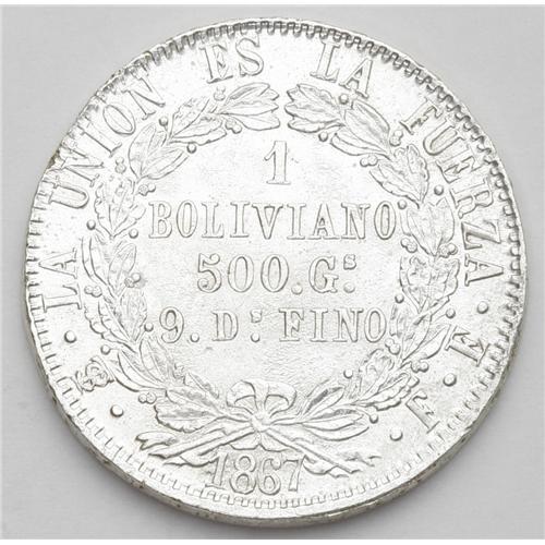 <B>Republic Boliviano 1867-FE, </B></I>KM152.2, choice lustrous AU-UNC, sharp details and full luster, one tiny edge flaw.
