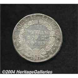 <B>Republic. Boliviano 1867-FE, </B></I>KM152.3, superb AU-UNC, light blue and gold toning over remarkably reflective fields, one of the nicest early Bolivianos that you will ever see. <BR><BR><B>Important notice:</B> Heritage usually auctions material at the rate of 200-250 lots per hour. On some occasions eBay Live bid software or the Internet may not be able to keep up with the pace of the auction. We recommend placing a realistic absentee bid now as insurance to avoid disappointment. Occasionally the auctioneer may eliminate or reject an eBay Live bid, and the auctioneer may also reopen a lot after the close of the eBay live bidding (usually because we missed an audience bid), and may reject your bid even if it shows you as the winning bidder. By bidding via eBay Live, you agree that Heritage may award the lot to another bidder at its sole discretion under the circumstances described above or any other reasonable circumstances. Since eBay bids are not shown to us until we open the lot on the floor, we treat those bids just like floor bids. In most cases the floor responds before the eBay bid is presented to us, due to Internet lag time, so for consistency we have made it a policy that floor bids are always considered first over tie eBay live bids. Also please note that all Heritage lots purchased through eBay Live carry a 20% Buyer's Premium. Please make sure you read the Terms and Conditions before you bid.