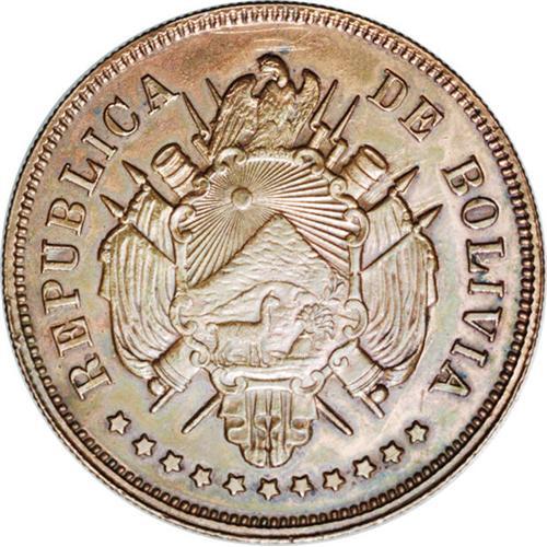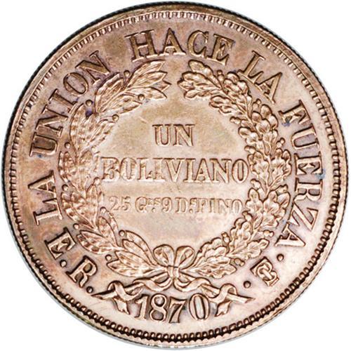 <B>Republic Bronze Pattern Boliviano 1870-ER, </B></I>KM-Pn38, AU-UNC, cleaned long ago and now nicely toned, few tiny scratches, ex-Farouk Collection. Very rare.