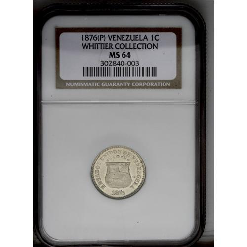 <B>Republic Centavo 1876(P), </B></I>KM-Y25, MS64 NGC, fully lustrous and completely original, ex-Pittman Collection, lot 3683. Rare in this quality.