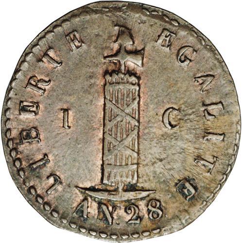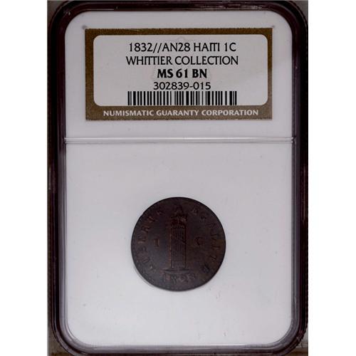 <B>Republic Centime 1832-An 28, </B></I>KMA21, MS61 NGC Brown, a choice example of this rare mule with flashes of original mint red on both sides. This variety was created by a muling of the 1832 obverse with the older year 28 reverse. Very rare quality!