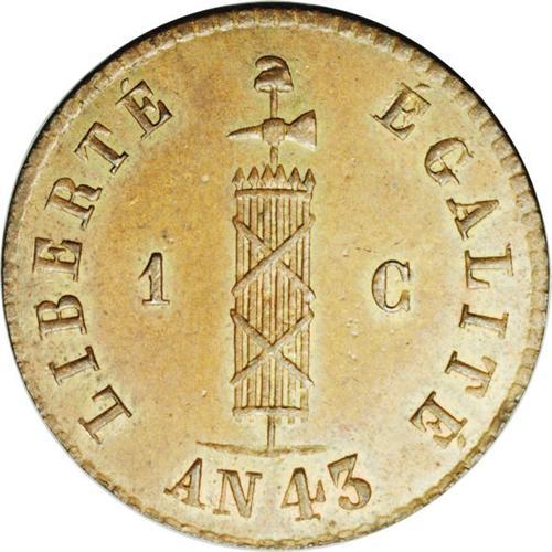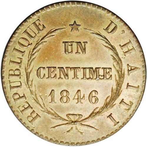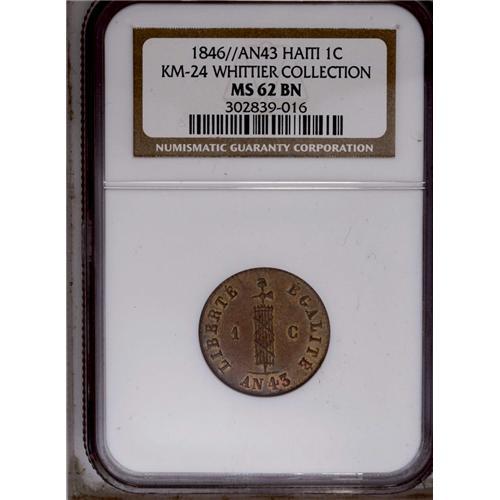 <B>Republic Centime 1846-An 43, </B></I>KM24, MS62 NGC Brown, abundant mint luster and possibly a Proof striking. The details are very sharp. Ex-Superior Sale, 12-1989.
