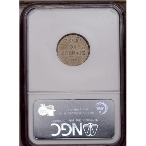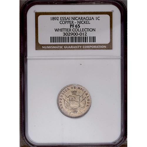 <B>Republic Copper-Nickel Pattern Centavo 1892, </B></I>KM-unlisted, Proof 65 NGC, an exceptionally choice example with brilliant proof surfaces. Reverse type with ESSAI DE MONNAIE 1892.