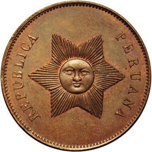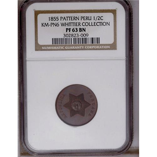 <B>Republic Copper Pattern 1/2 Centimo 1855, </B></I>KM-Pn6, Proof 63 NGC Brown, a superb example of this sunface issue with wonderful orange and purple sheen. Rare and attractive type, underrated in the SCWC.