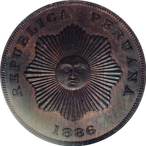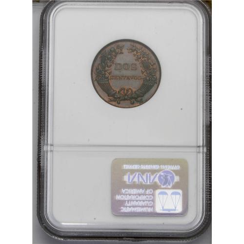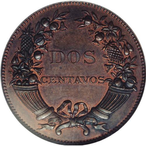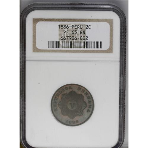 <B>Republic Copper Pattern 2 Centavos 1886, </B></I>KM-Pn25, Proof 65 NGC Brown, very attractive with some original luster on the reverse. The details are exceptionally sharp. Rare type with only a few examples reported.