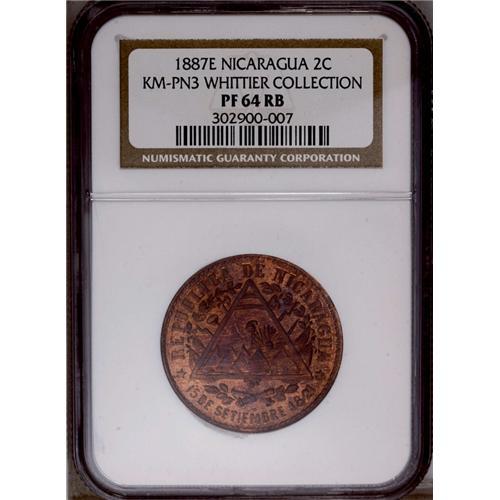 <B>Republic Copper Pattern 2 Centavos 1887E, </B></I>KM-Pn3, Proof 64 NGC Red & Brown, virtually fully lustrous with mirror surfaces.
