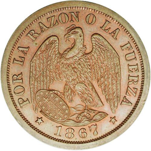 <B>Republic Copper Pattern 20 Centavos 1867, </B></I>KM-Pn11, MS64 NGC Brown, an attractive piece with subdued red-orange luster adding to the appealing deep brown surfaces. Rare and very desirable pattern.
