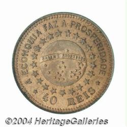 Republic. Copper Pattern 40 Reis 1889, KM-Pn172, Standing Libertad/Globe with stars. Choice UNC with orange luster and just a faint fingerprint mark in the obverse field. Very scarce and popular issue.From the Morris Geiger Collection. Important notice: Heritage usually auctions material at the rate of 200-250 lots per hour. On some occasions eBay Live bid software or the Internet may not be able to keep up with the pace of the auction. We recommend placing a realistic absentee bid now as insurance to avoid disappointment. Occasionally the auctioneer may eliminate or reject an eBay Live bid, and the auctioneer may also reopen a lot after the close of the eBay live bidding (usually because we missed an audience bid), and may reject your bid even if it shows you as the winning bidder. By bidding via eBay Live, you agree that Heritage may award the lot to another bidder at its sole discretion under the circumstances described above or any other reasonable circumstances. Also please note that all Heritage lots purchased through eBay Live carry a 20% Buyer's Premium. Please make sure you read the Terms and Conditions before you bid.
