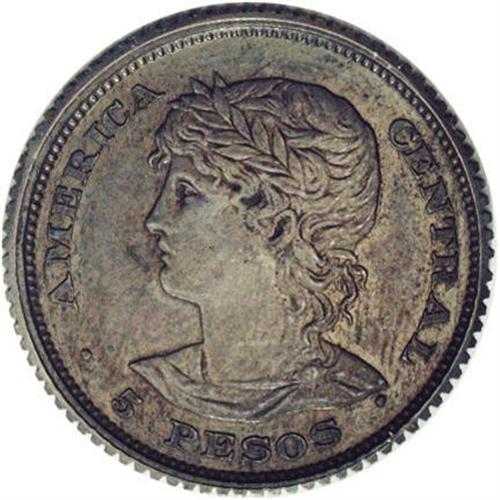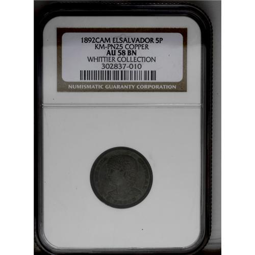 Republic Copper Pattern 5 Pesos 1892-CAM, KM-Pn25, AU58 Republic Copper Pattern 5 Pesos 1892-CAM,