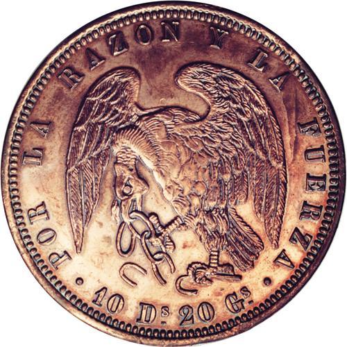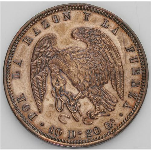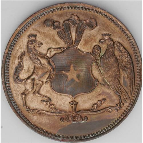 <B>Republic Copper Pattern 8 Reales ND (1837), </B></I>KM-PnA3, sharp AU, prooflike surfaces, cleaned long ago and now nicely toned. Obverse: The condor design adopted for KM96; Reverse: Crowned horse and eagle supporting the arms of Chile. A rare and important pattern, plain edge, 22.77 grams.