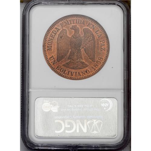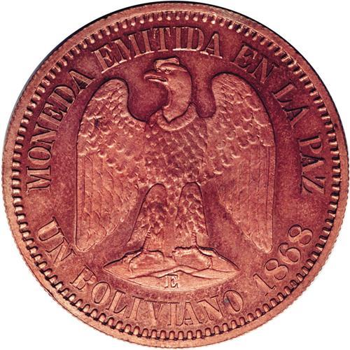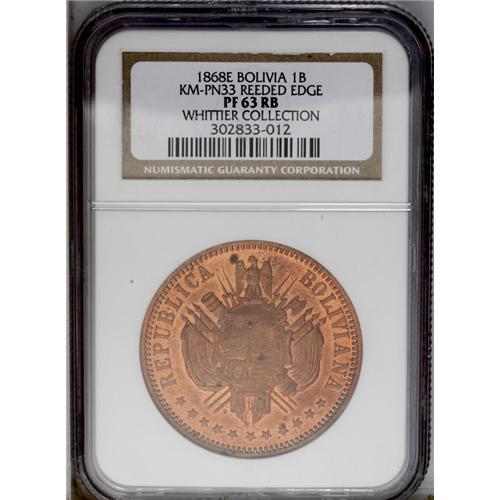 <B>Republic Copper Pattern Boliviano 1868-E, </B></I>KM-Pn33, reeded edge, Proof 63 NGC Red & Brown, virtually full mint brilliance with a few very light spots. Type with E, without CT and value as UN BOLIVIANO.