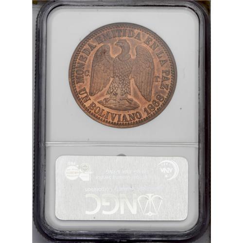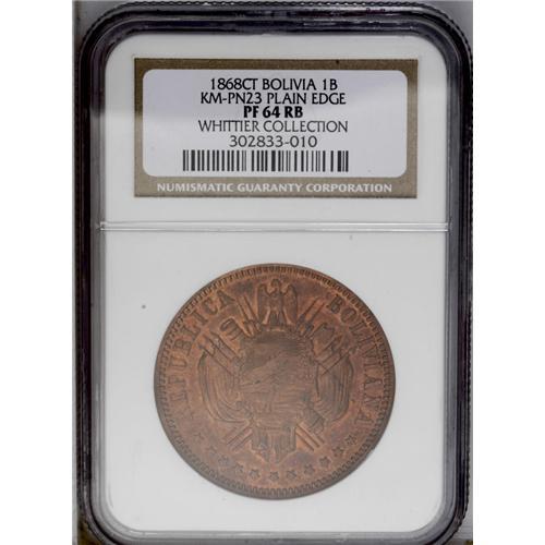 <B>Republic Copper Pattern Boliviano 1868-CT, </B></I>KM-Pn23, plain edge, Proof 64 NGC Red & Brown, type with UN BOLIVIANO and without E. A highly lustrous and very handsome example.