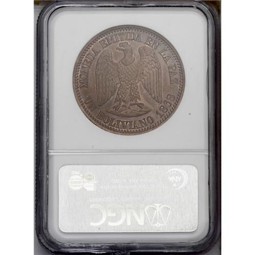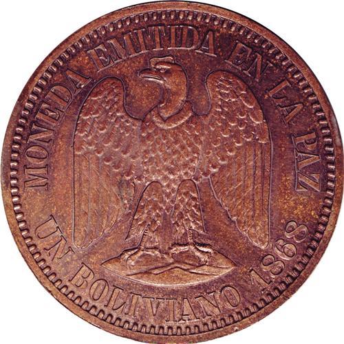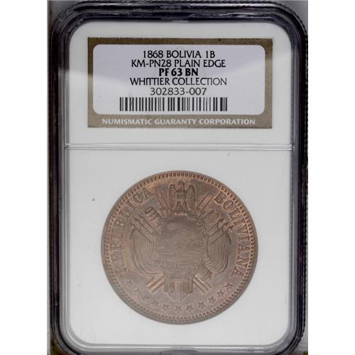 <B>Republic Copper Pattern Boliviano 1868, </B></I>KM-Pn28, plain edge, Proof 63 NGC Brown, an attractive example with considerable mint luster. Type without CT or E, value as UN BOLIVIANO.
