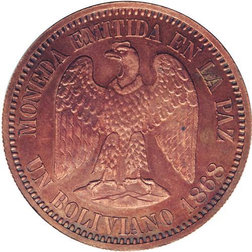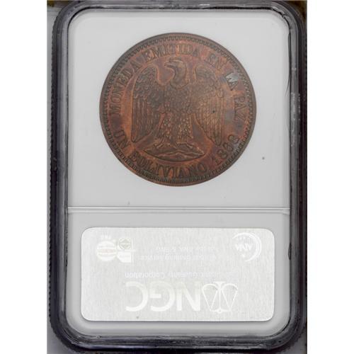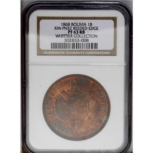 <B>Republic Copper Pattern Boliviano 1868, </B></I>KM-Pn32, reeded edge, Proof 63 NGC Red & Brown, attractive deep orange toning. Type without CT or E and value as UN BOLIVIANO.