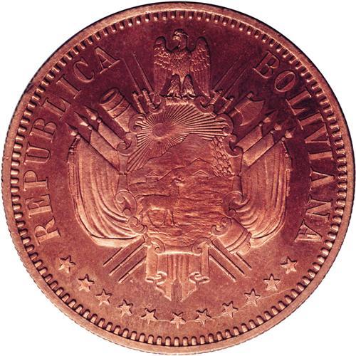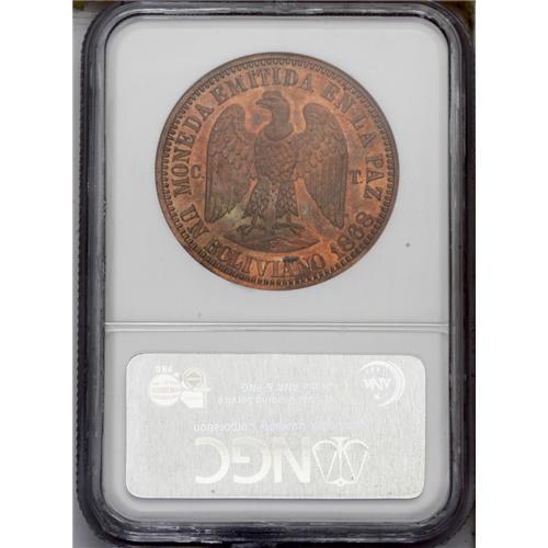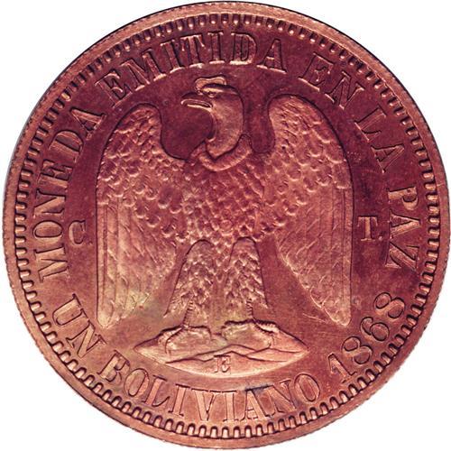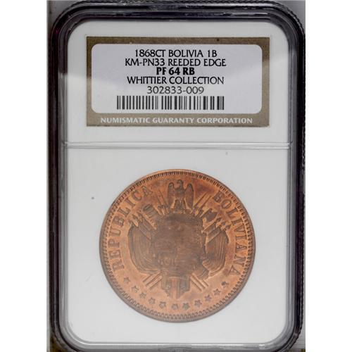 <B>Republic Copper Pattern Boliviano 1868CT-E, </B></I>KM-Pn33, reeded edge, Proof 64 NGC Red & Brown, flashy red-orange luster and mirror surfaces. Type with CT and E and value as UN BOLIVIANO.