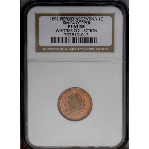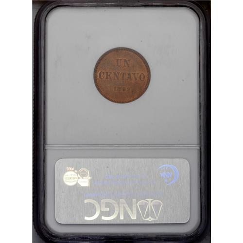 <B>Republic Copper Pattern Centavo 1892 Pair, </B></I>KM-Pn31, Proof 61 Red NGC, and KM-P4 Piefort, Proof 63 NGC Red & Brown. Reverse with UN CENTAVO 1892.