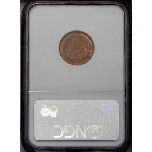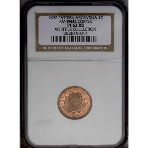 <B>Republic Copper Pattern Centavo 1892 Pair, </B></I>KM-Pn32, Proof 63 NGC Red & Brown and KM-P5 Piefort, Proof 62 NGC Red & Brown. Reverse with 1 CENTAVO 1892 within a wreath.