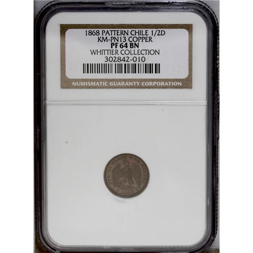 <B>Republic Copper Pattern Medio Decimo 1868, </B></I>KM-Pn13, Proof 64 NGC Brown, a choice example with mint luster in the legends. Ex-Norweb 32109 and Brand.