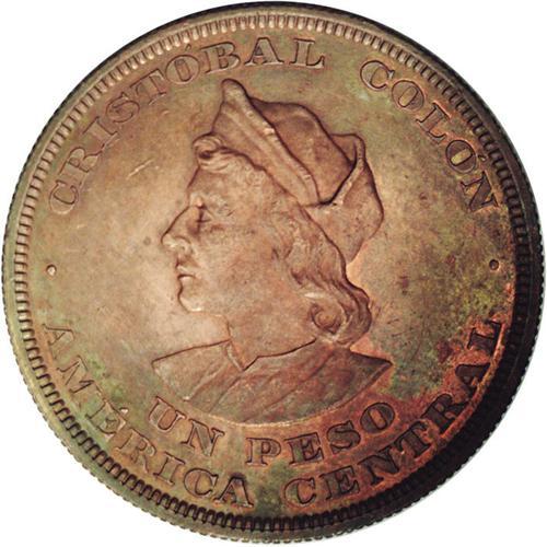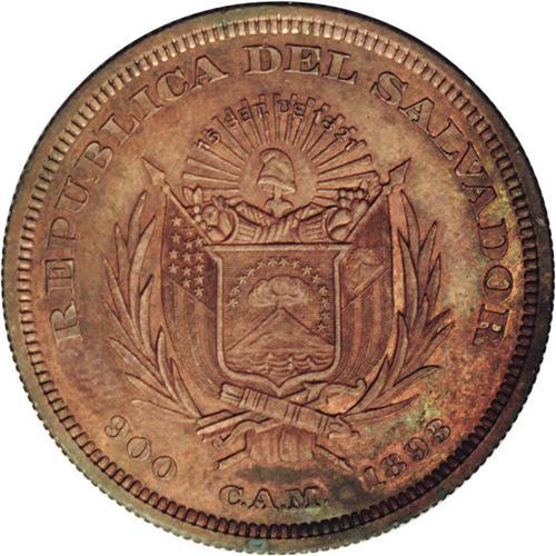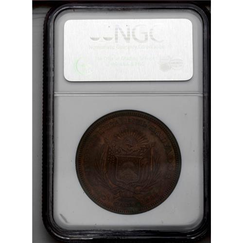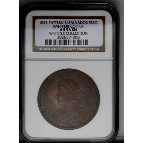<B>Republic Copper Pattern Peso 1893-CAM, </B></I>KM-Pn38, AU58 NGC Brown, very close to mint state with considerable luster in the recessed areas. Rare and desirable pattern issue.