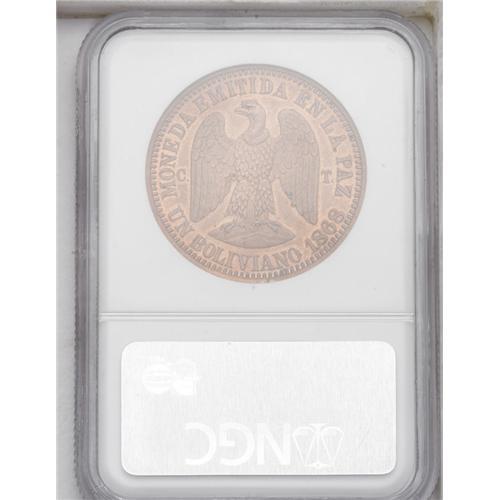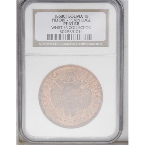 <B>Republic Copper Piefort Pattern Boliviano 1868-CT, </B></I>similar to KM-P6 but not in silver, plain edge, Proof 63 NGC Red & Brown, an appealing and highly lustrous example with just a few tiny spots. Type with CT, without E and value as UN BOLIVIANO.