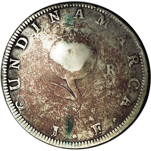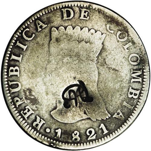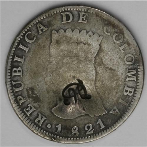 <B>Republic Countermarked Coinage, </B></I>KM10, Colombia-Cundinamarca 8 Reales 1821-JF with the MDQ monogram, Moneda de Quito. An exceptional example with a bold counterstamp on a nicely toned VG host coin. Very scarce type.