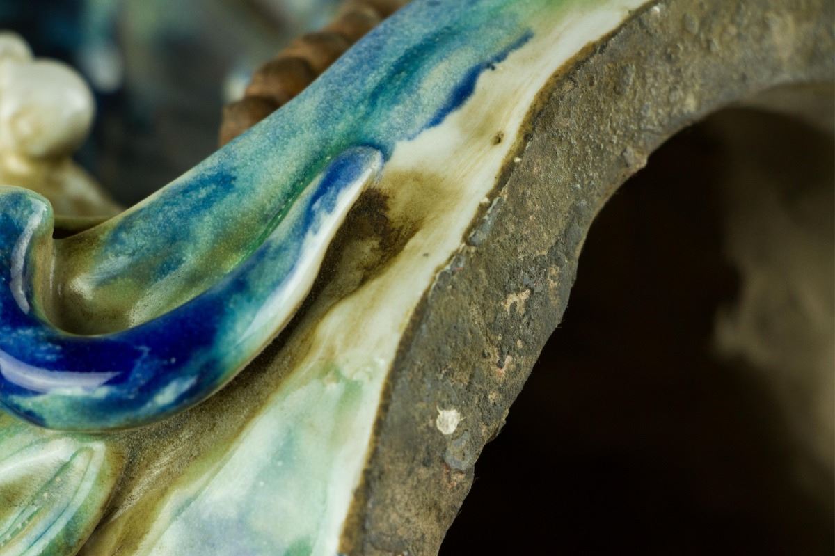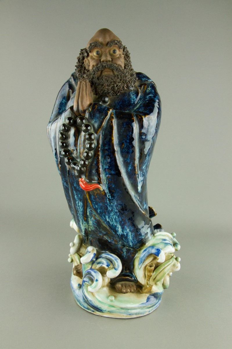 Chinese Republic glazed porcelain figure; depicting Damo Bodhidharma standing barefoot on swirling waves; H: 38 cm, L: 20 cm, 3896 grams