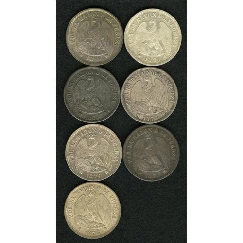 <B>Republic - Date Collection of Condor Pesos, </B></I>KM142.1, seven dates including: 1869 toned XF-AU, 1870 AXF, 1871 toned AU, scarce date, 1873 choice toned XF-AU, 1874 lustrous AU, 1875 toned AU, small rim bump, and 1876 lightly toned AU-UNC, fully original and very attractive. An unusually attractive group of these early dates. <B>Sold as is, no return lot.</B></I><BR><BR><b>Shipping:</b> Coin/Currency (<a target="_blank" href="http://www.heritageauctions.com/common/shipping.php">view shipping information</a>)