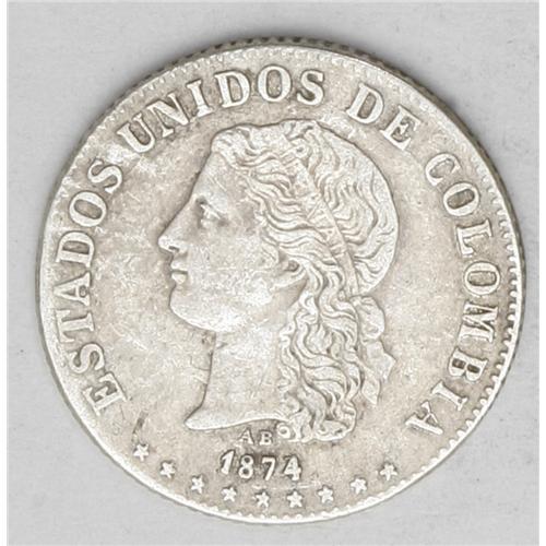 <B>Republic Decimo 1874/3-AB Medellin, </B></I>KM151.2, very nice VF, strong details and a rare one-year type.