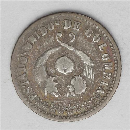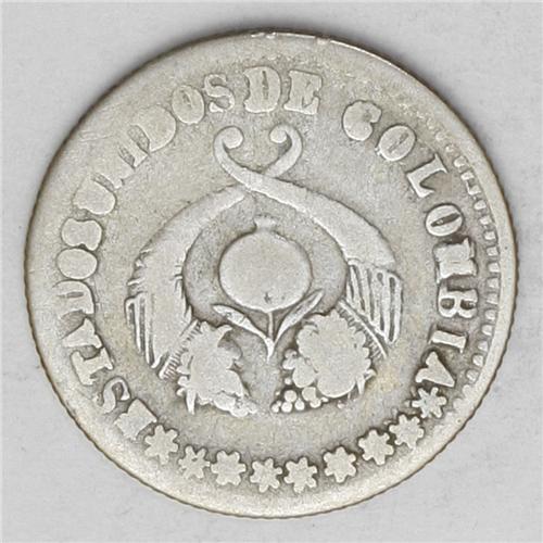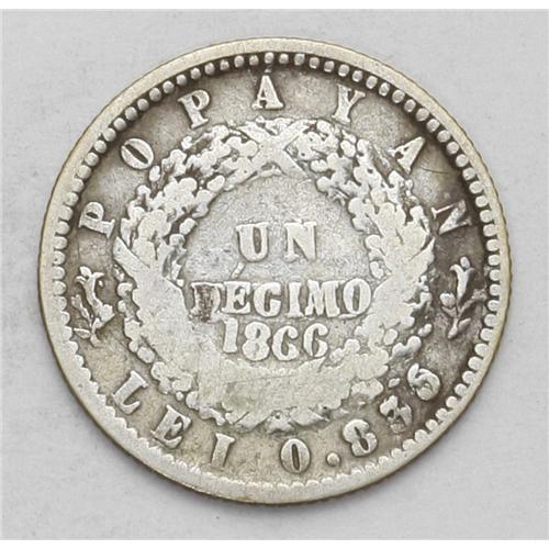 <B>Republic Decimo - Two Types, </B></I>KM145.2, 1864 Popayan, nice toned Fine, 900 Fine, and KM145.2a, 1866 Popayan, nearly Fine, very clear details, fineness reduced to .835, rare type.