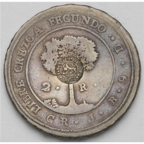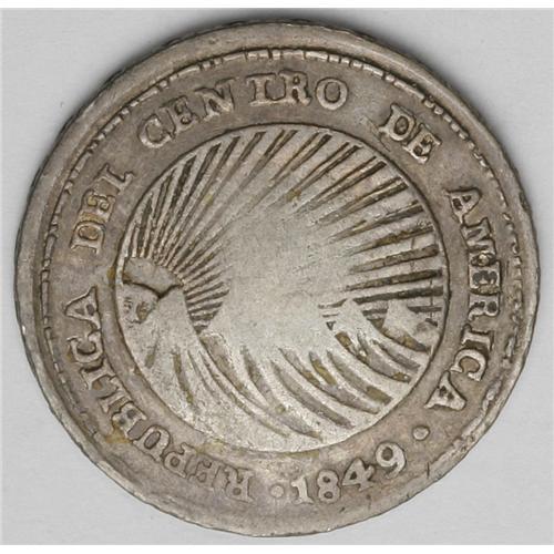 <B>Republic - Early Silver Pair, </B></I>KM32 1/2 Real 1842-MM, nice toned F-VF, few small surface marks, rarely seen unholed, and KM77 2 Reales 1849-JB with the Lion counterstamp, the host coin is toned F-VF and the counterstamp is VF.