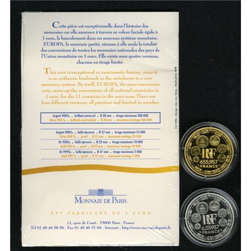 <B>Republic, Euro Conversion Coinage 1999,</B></I> Gold 655.957 Francs, KM1257, Silver 6.55957 Francs, KM1255, and Silver 6.55957 Francs, KM1254. The former two are Gem Proof in the case of issue and the latter is Gem Uncirculated in the envelope of issue. All include respective certificates.