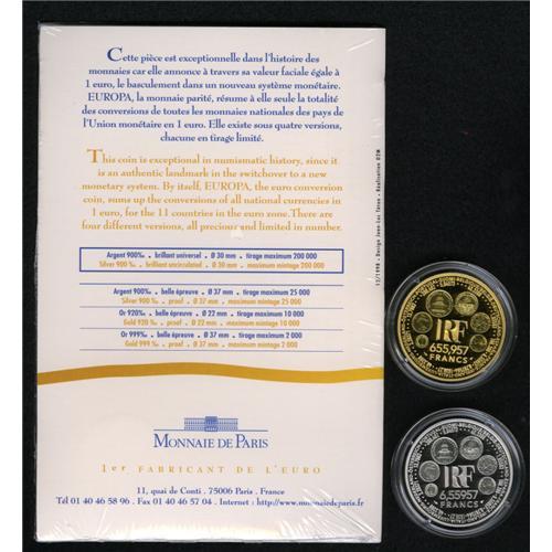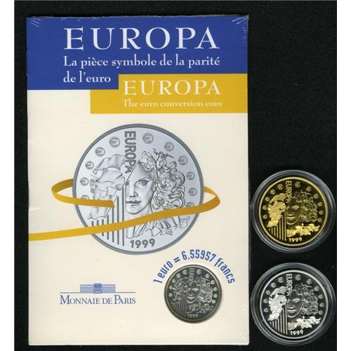 <B>Republic, Euro Conversion Coinage 1999,</B></I> Gold 655.957 Francs, KM1257, Silver 6.55957 Francs, KM1255, and Silver 6.55957 Francs, KM1254. The former two are Gem Proof in the case of issue and the latter is Gem Uncirculated in the envelope of issue with respective certificates.