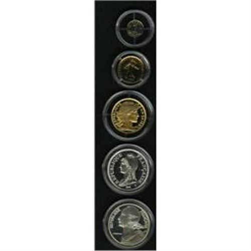 <B>Republic, "Farewell to the Franc" Coin Set 2000</B></I> Includes Gold 1 Centime, KM928a, Gold 1 Franc, KM925.1, Silver 10 Francs with obverse design copying the 1962 obverse design by Henri Lagriffoul, unlisted, Silver 10 Francs with obverse design copying the 1795 obverse design by Augustin Dupre, unlisted, and Gold 100 Francs with obverse design copying the 1898 obverse design by Jules Chaplain, unlisted. Each coin is Gem Proof and the set is housed in a fancy case with certificates.