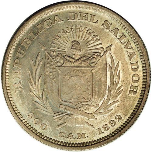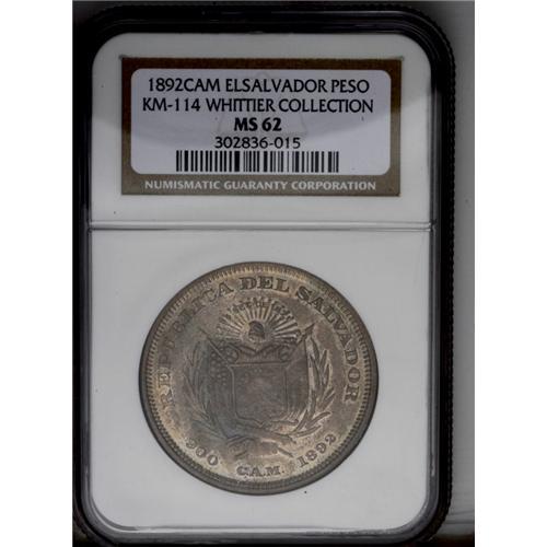 <B>Republic Flag Peso 1892, </B></I>KM114, MS62 NGC, an exceptionally appealing example of this one-year type with light gray-gold toning and virtually full mint luster. Truly mint state specimens of the Flag Peso are rarely encountered in the marketplace, and this coin easily qualifies.