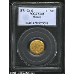 Republic Gold 2 1/2 Pesos 1871Go-S, KM411.3, AU58 PCGS, pale violet patina has a muting effect on bo