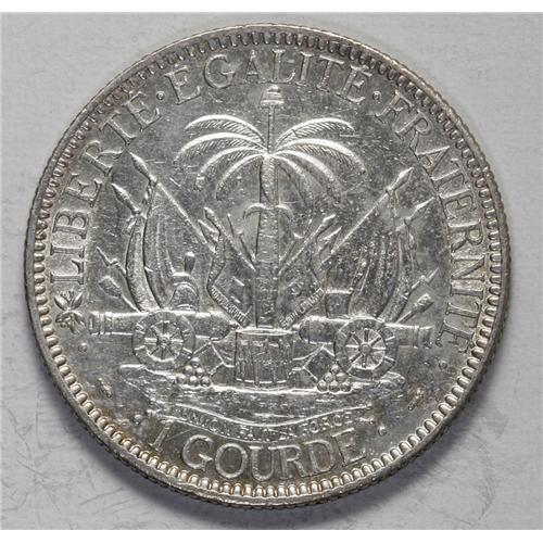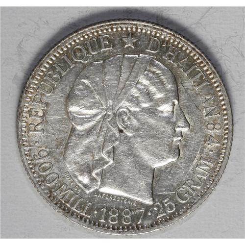 <B>Republic Gourde 1887, </B></I>KM47, lustrous XF-AU, some faint hairlines, plus a fantasy Crown dated 1811, minted for G. Hearns in London in the 1950s, similar to KM-Pn31-35.<BR><I>From the Monedas Oro Collection</B></I><BR><BR><b>Shipping:</b> Coin/Currency (<a target="_blank" href="http://www.heritageauctions.com/common/shipping.php">view shipping information</a>) <BR><BR><B>Important