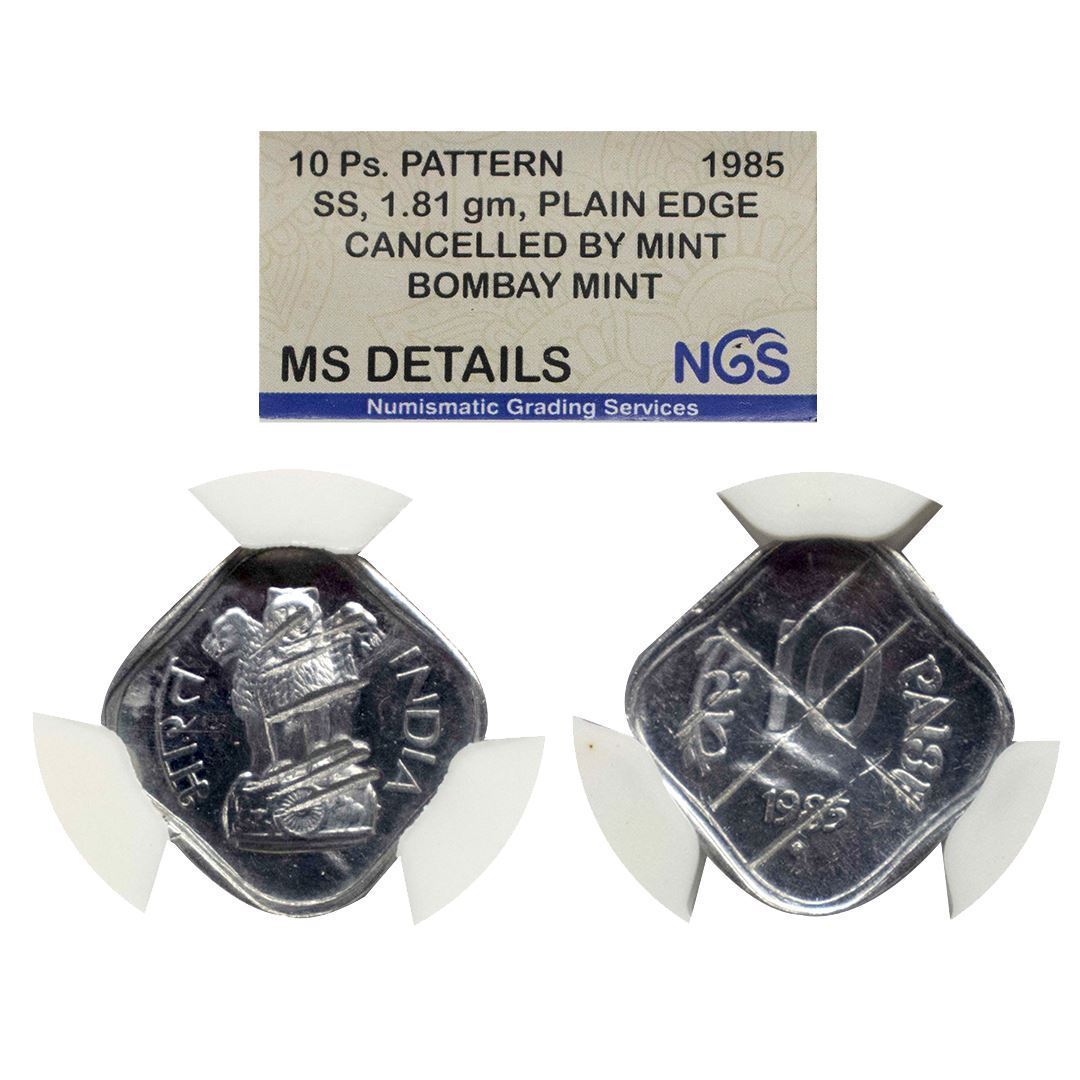 Republic India, 10 Paisa, Pattern, Cancelled by the MInt, 1985, Bombay Mint, Stainless Steel, Plain Edge, Graded MS Details by NGS, Extremely Rare.