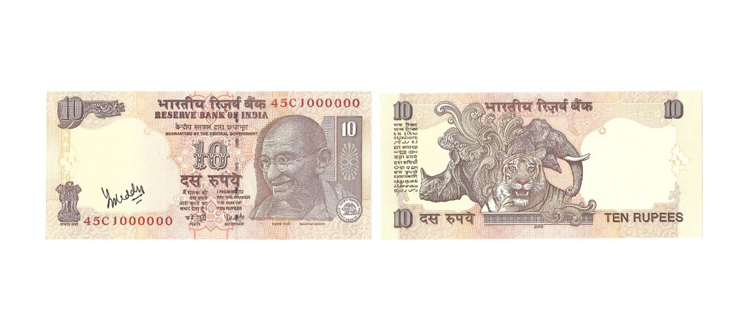 Republic India, 10 Rupee, Fancy Number, Serial No.: 45C 1000000, Signed by Y.V. Reddy, Inset A, Hand