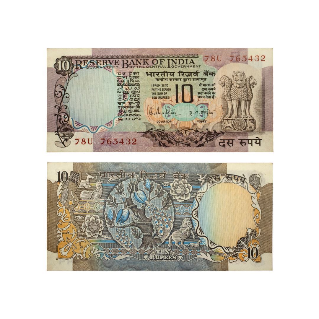 Republic India, 10 Rupees, Peacock series, R. N. Malhotra, Fancy Number, 78U 765432.