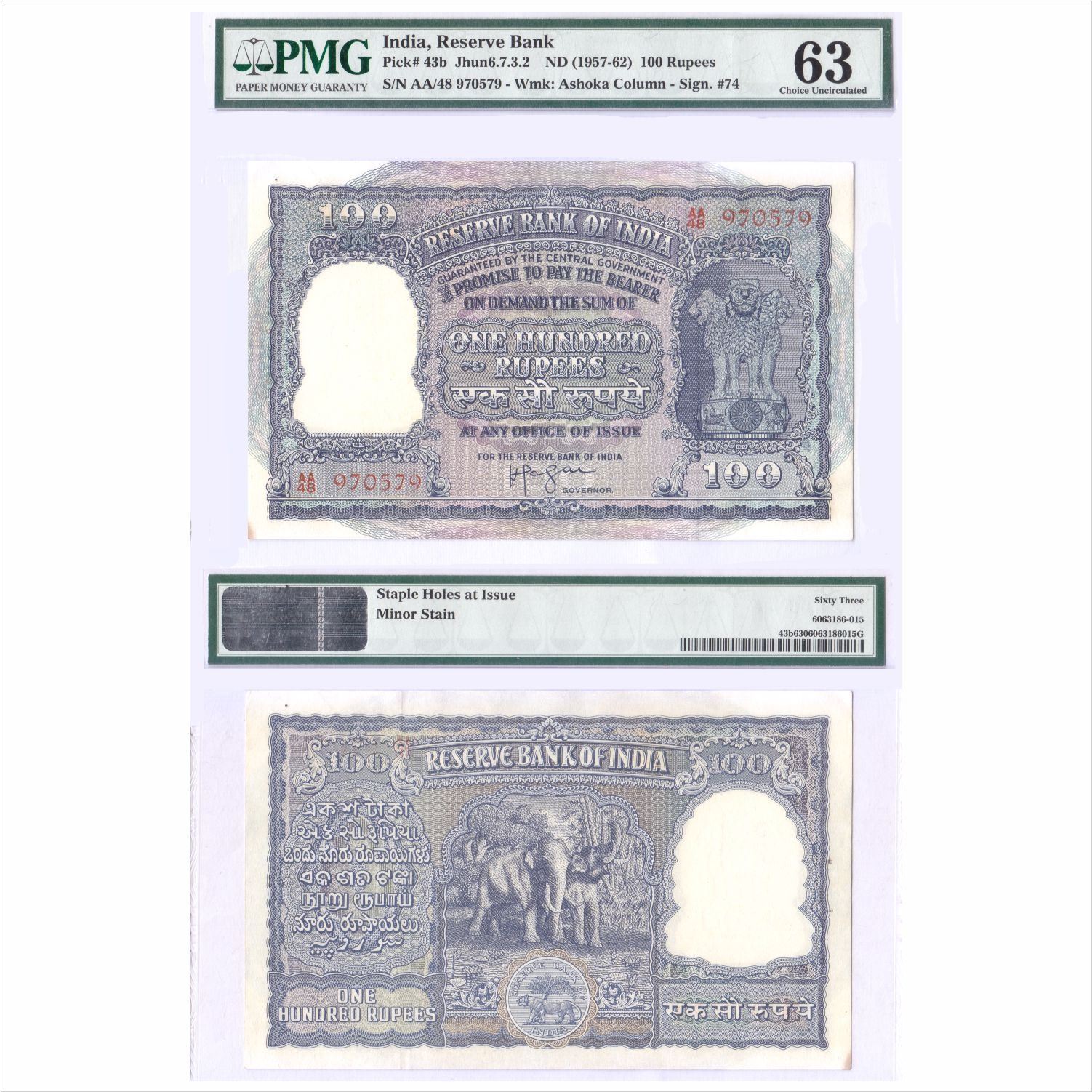 Republic India, 100 Rupees, Fourth Issue, ND (1957 - 62), signed by H V R Iyenger, Value in Hindi reads 'RUPAYE', with Red Serial Number at top right & bottom left picture of pair of elephant at back (KK & RR # 6.7.3.2) in PMG Holder 63 - Choice Uncirculated.