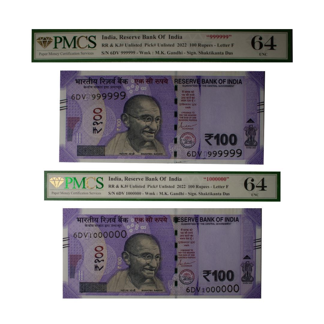 Republic India, 100 Rupess, 2 Notes, Fancy Number 999999 and 1000000, Same Prefix- 6DV, Signed by Shaktikanta Das, Graded by PMCS as 64 UNC