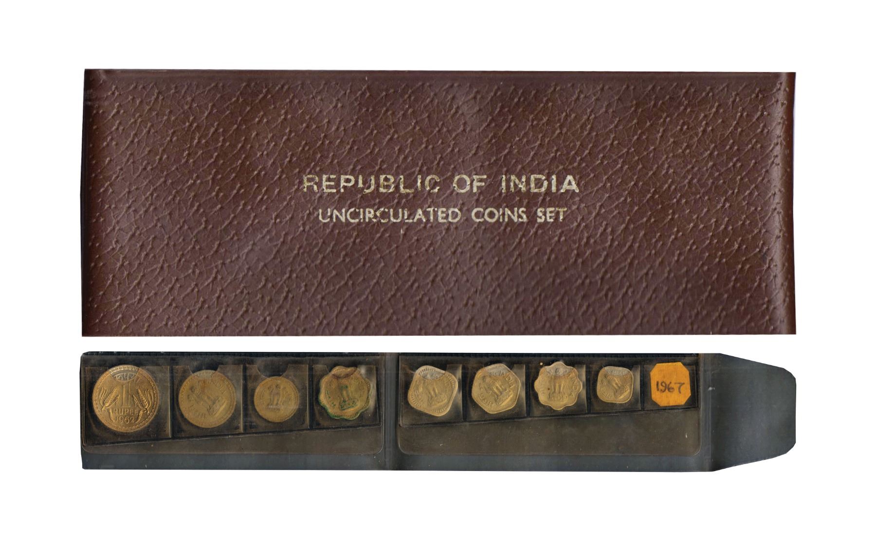 1967, UNC set of 8 coins in strip packing, 1 rupee (1962), 50 paisa, 25 paisa, 10 paisa, 5 paisa, 3 paisa, 2 paisa and 1 paisa, Bombay mint, RB 15, in original mint packing.