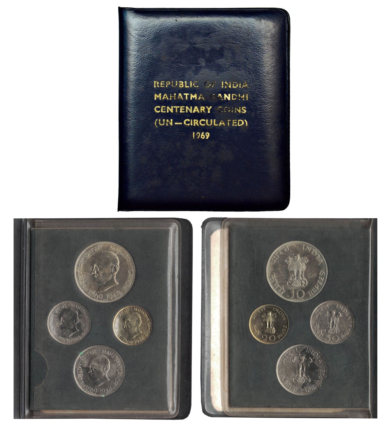1969, Mahatma Gandhi Centenary, UNC set of 4 coins, 10 rupees, 1 rupee, 50 paise and 20 paise, Bombay mint, RB 17, in original blue pouch packing.