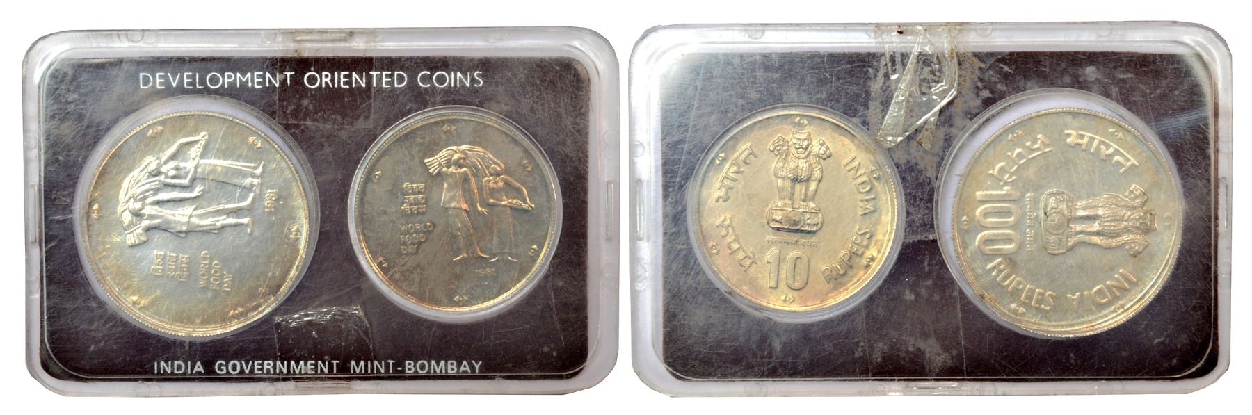 1981, World Food Day, UNC set of 2 coins, 100 rupees and 10 rupees, Bombay mint, RB 86, without outer cover and detail card, weather effect on coins.