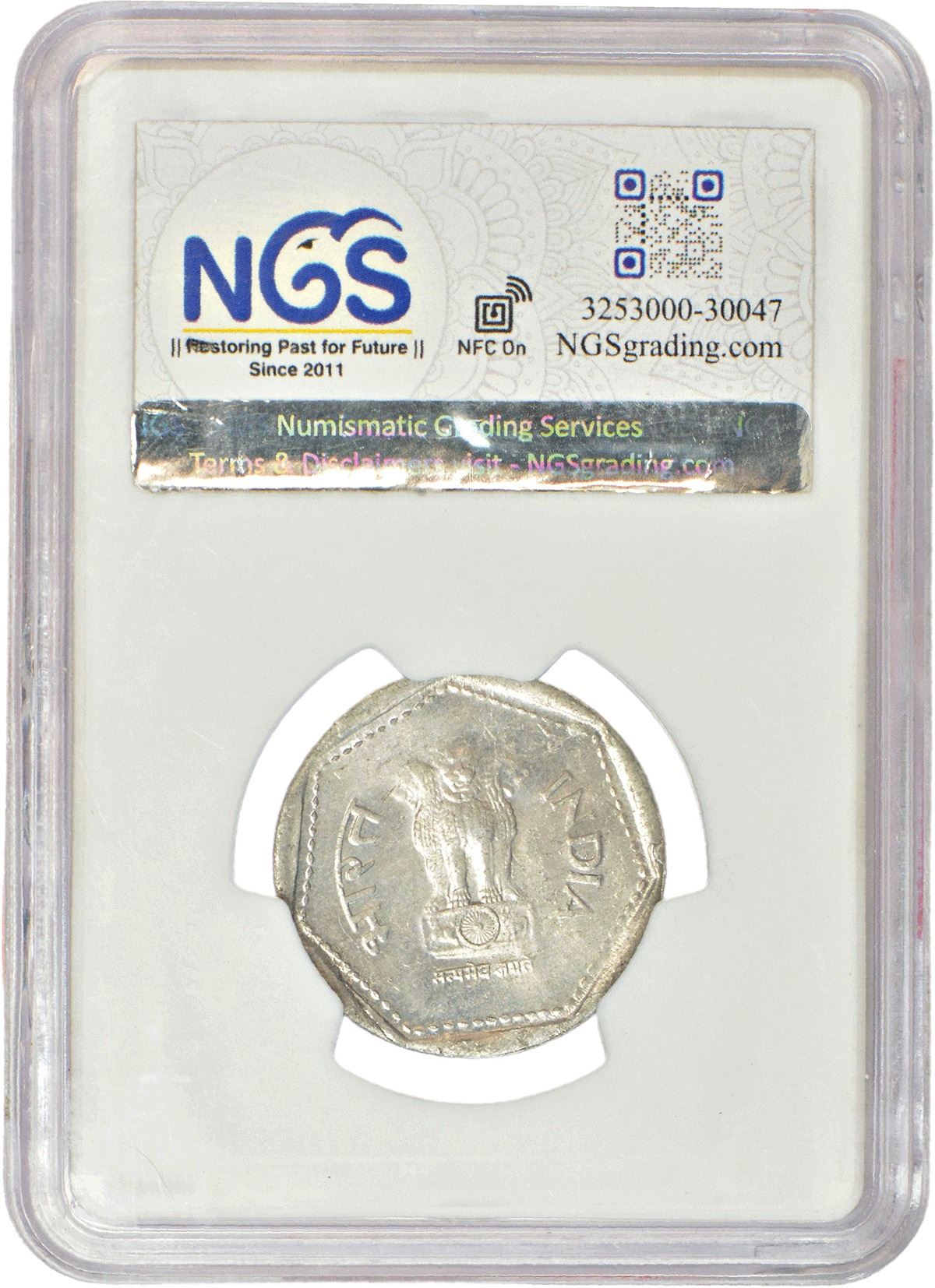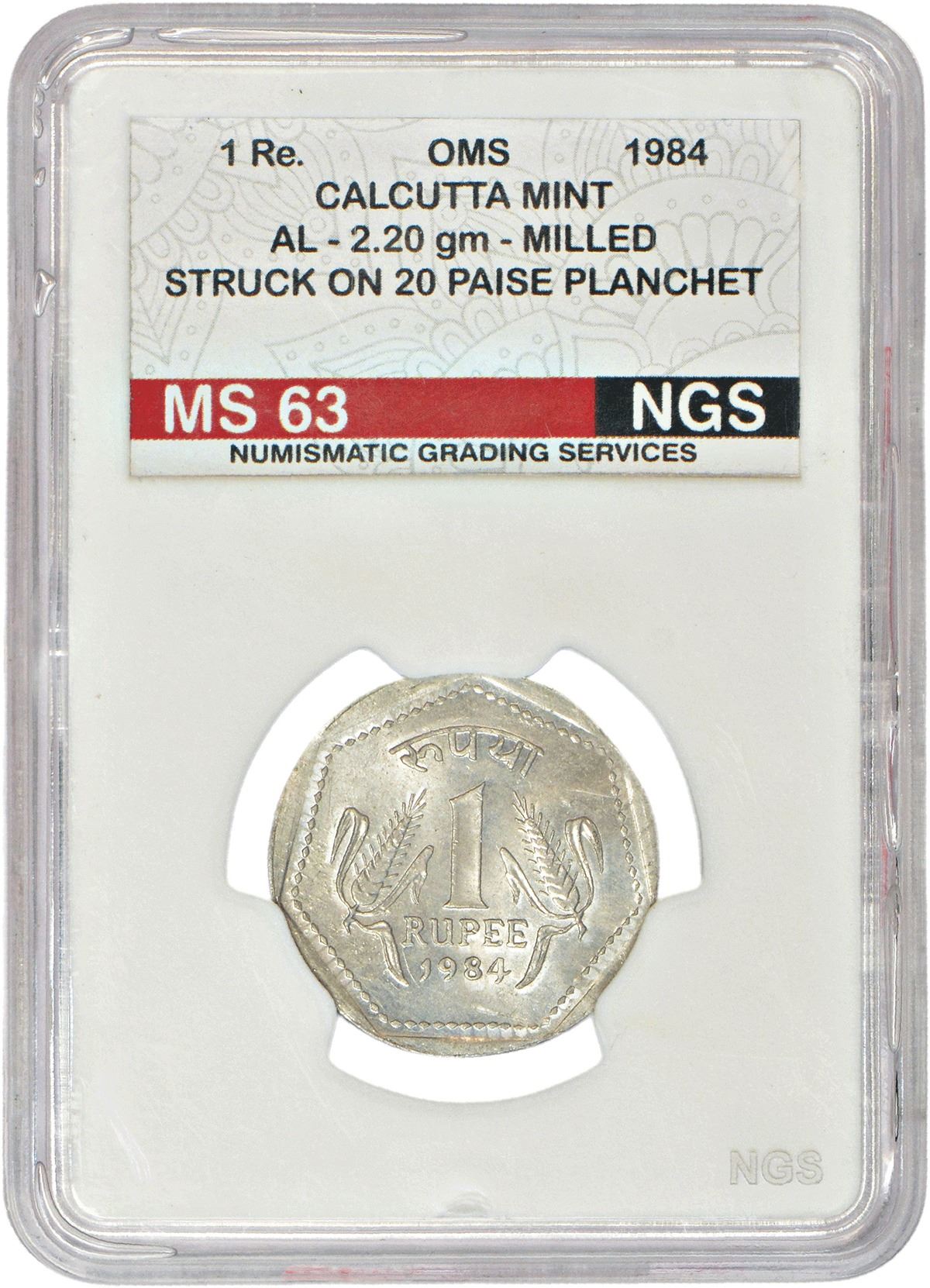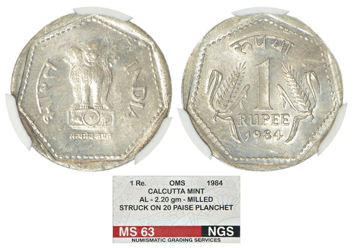 1984, 1 rupee, error, Calcutta mint, off metal strike (OMS), wrongly struck in aluminium on a 20 paise planchet.